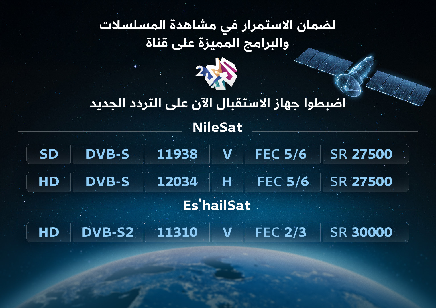 اعتبارًا من اليوم، يُرجى من المشاهدين الكرام ضبط أجهزة الاستقبال على الترددات الجديدة التالية: