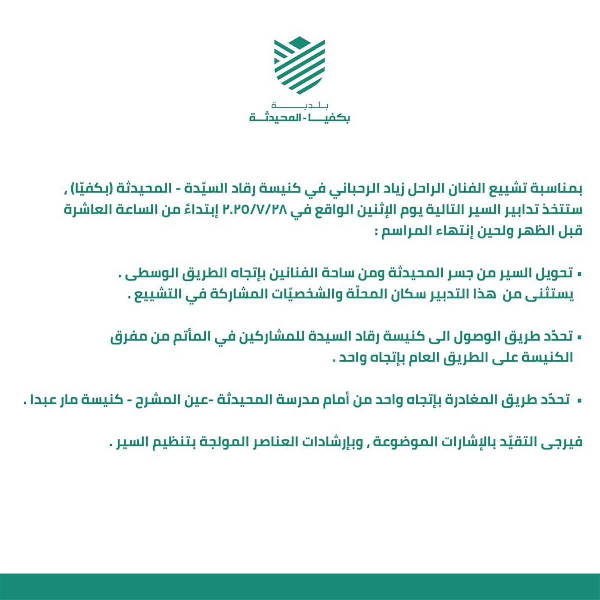 1- تحويل السير من جسر المحيدثة ومن ساحة الفنانين باتجاه الطريق الوسطى، ويستثنى من هذا التدبير سكان المحلة والشخصيات المشاركة في التشييع.