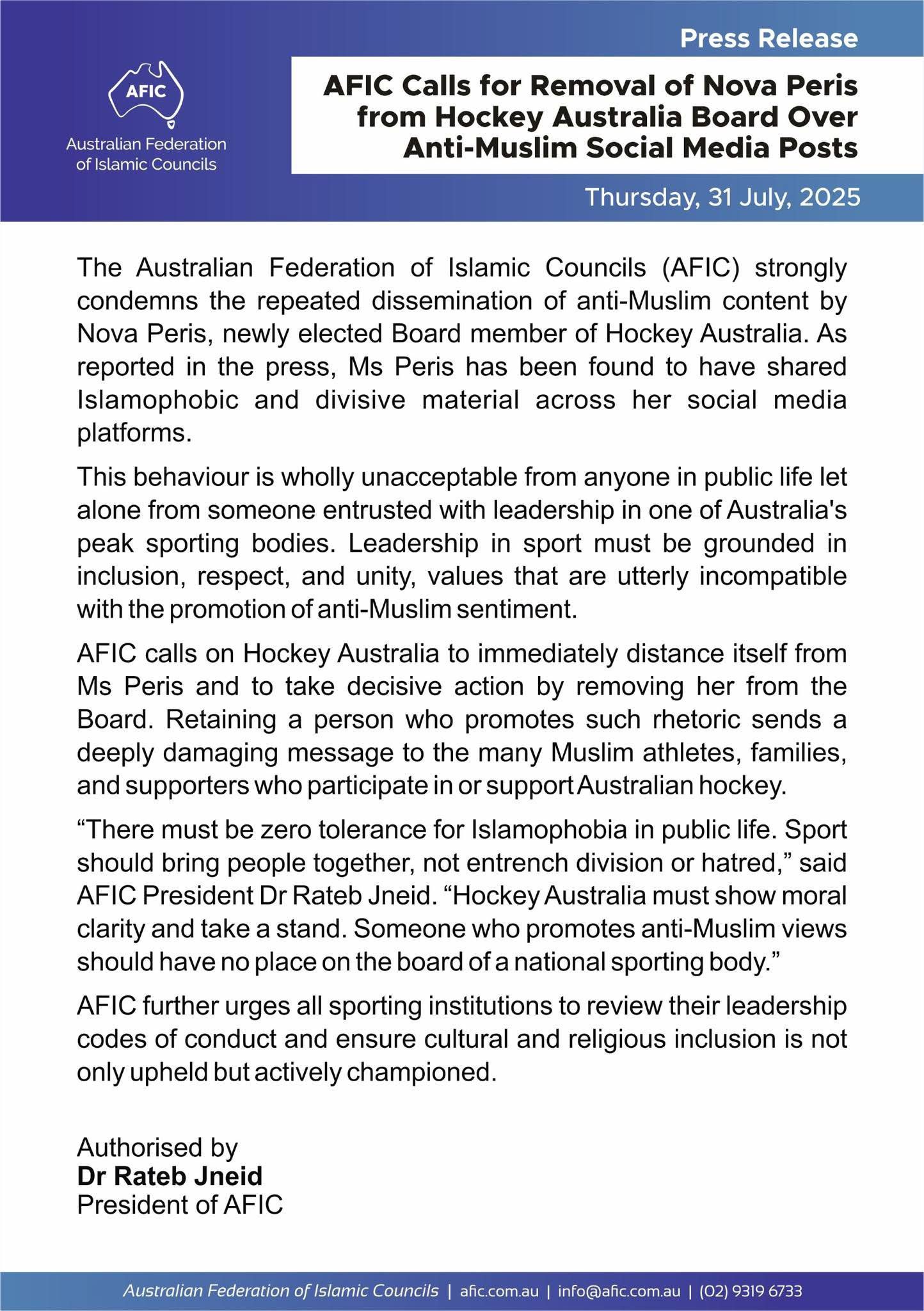 AFIC calls on Hockey Australia to immediately distance itself from Ms Peris and to take decisive action by removing her from the Board. Retaining a person who promotes such rhetoric sends a deeply damaging message to the many Muslim athletes, families, and supporters who participate in or support Australian hockey.