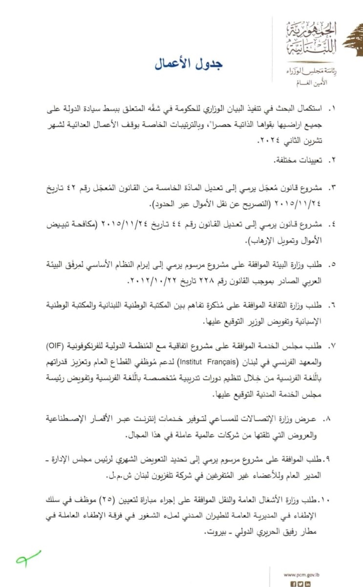 إليكم جدول أعمال جلسة مجلس الوزراء في الصورة أدناه:
