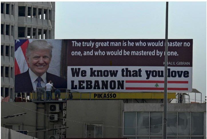 فوجئ اللبنانيون بإقدام مجهولين على رفع صورة كبيرة للرئيس الأميركي دونالد ترامب في منطقة “جسر الواطي” في بيروت لجهة منطقة سن الفيل مع عبارة باللغة الإنكليزية “نحن نعلم أنّك تحب لبنان” ومقولة للكاتب اللبناني جبران خليل جبران “إنما الرجل العظيم ذلك الذي لا يسود ولا يُساد” وعلم لبنان، مما شكّل استفزازاً لغالبية اللبنانيين الذين يهدّدهم ترامب بحرب مدمّرة تشنها “إسرائيل” عليهم، وفي ظل جرائم الإبادة الجماعية التي تحصل في غزة بسلاح وغطاء من ترامب نفسه.