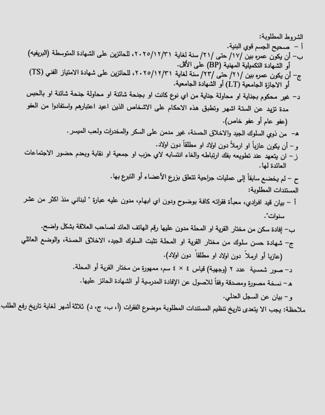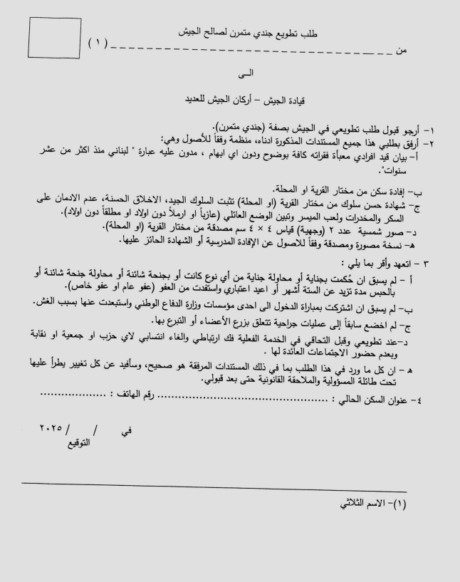 وأضاف البيان: سيصار إلى اختيار العدد اللازم بالأفضلية لتطويعه في الجيش، وفقًا للحاجة التي تحددها القيادة في حينه. وسيتم الاطلاع على بقية الشروط والمستندات المطلوبة في قيادات المناطق والمواقع والثكنات العسكرية، وعلى موقع الجيش على الإنترنت: www.lebarmy.gov.lb.