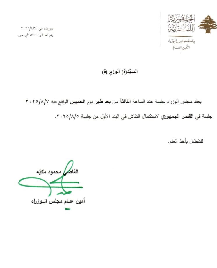يعقد مجلس الوزراء جلسة عند الساعة الثالثة من بعد ظهر يوم الخميس الواقع فيه 7-8-2025، في القصر الجمهوريّ، لاستكمال النقاش في البند الأوّل من جلسة 5-8-2025.