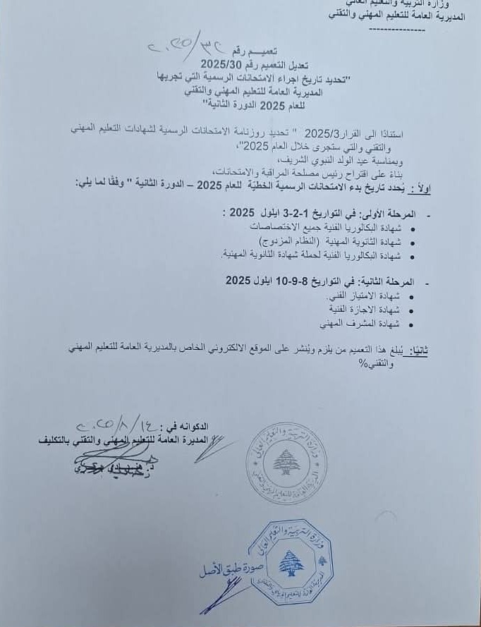 عدلت وزارة التربية والتعليم العالي مواعيد إجراء امتحانات الدورة الثانية لشهادات التعليم المهني والتقني.