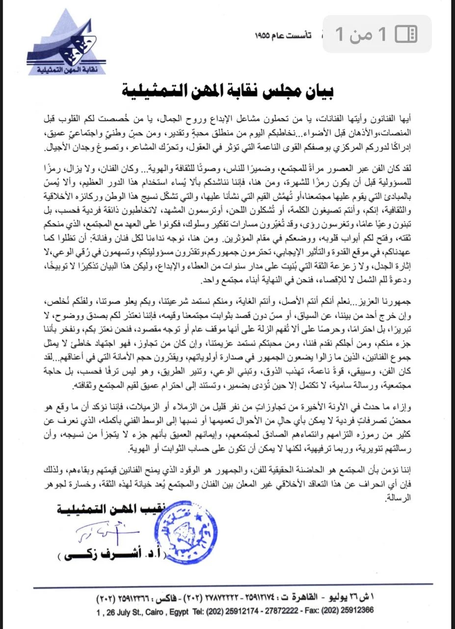 وأصدر مجلس النقابة في وقت لاحقاً بياناً وجهه إلى “الفنانين والفنانات” محذراً إياهم من إساءة استخدام دور الفنان وشهرته.