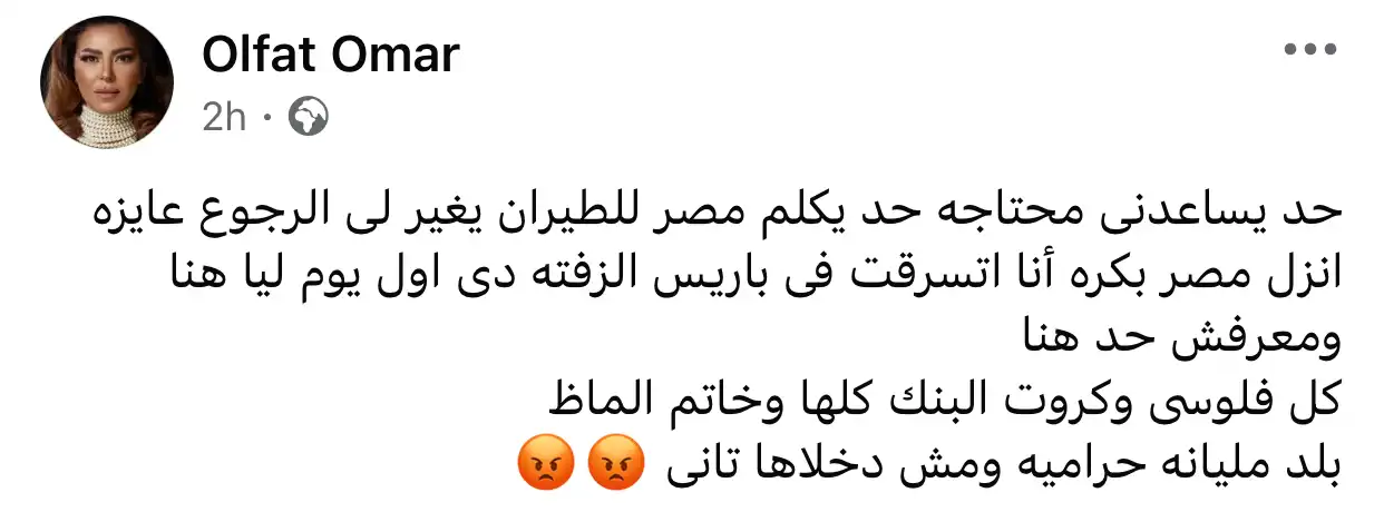 وقالت ألفت في منشورها على فيسبوك “حد يساعدني محتاجة حد يكلم مصر للطيران يغير لي الرجوع عايزة أنزل مصر بكرة أنا اتسرقت في باريس الزفتة دي أول يوم لي هنا ومعرفش حد هنا، كل فلوسي وكروت البنك كلها وخاتم ألماس، بلد مليانة حرامية ومش هدخلها تاني”، بحسب وسائل إعلام مصرية.