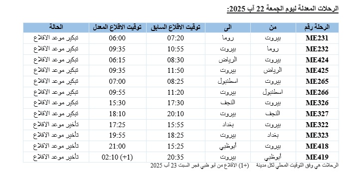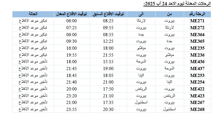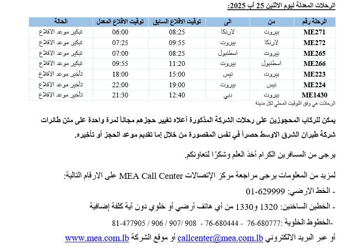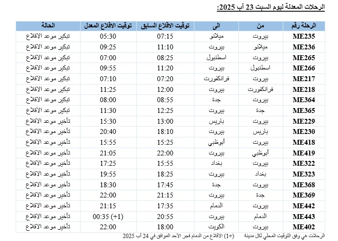 1- الغاء رحلة العودة من الكويت الى بيروت المجدولة ليوم السبت في 23 آب 2025 تحت رقم ME403 (موعد اقلاعها كان 21:15) بحيث سيتم تحويل الركاب الى الرحلة ME407 التي ستقلع من الكويت عند الساعة 20:20 مساء يوم السبت في 23 آب 2025