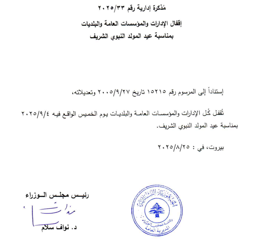 25AUG مذكرة بإقفال المؤسسات العامة بمناسبة ذكرى المولد النبوي الشريف Share Tweet Share Whatsapp Email صدر عن رئيس مجلس الوزراء بإقفال الادارات والمؤسسات العامة نهار الخميس 4/9/2025، بمناسبة ذكرى المولد النبوي الشريف. Related Posts"أمل" و"حزب الله" يدعوان إلى وقفة احتجاجيةأورتاغوس تعلّق على بيان نتنياهو بشأن لبنانجابر يلتقي وفد من الكونغرس الأميركيعبّود يتفقد مخيم الكشّاف الأرثوذكسي في بكفتينقوات الاحتلال تداهم معملاً في مركبا Post Author: SafirAlChamal