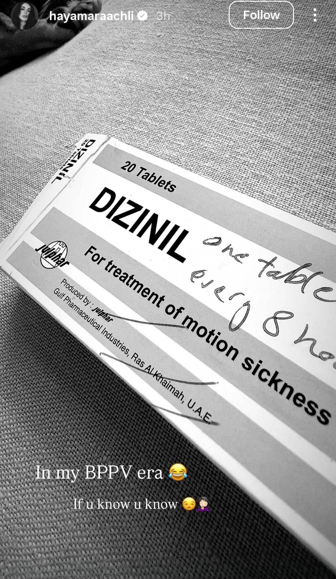 ونشرت هيا صورة لعلبة الدواء وارفقتها بتعليق طريف كتبت فيه: “في فترة معاناتي مع الدوار، إذا كنتم تعلمون بذلك”، مع ايموجي لوجوه ضاحكة وأخرى حزينة ومتعبة.