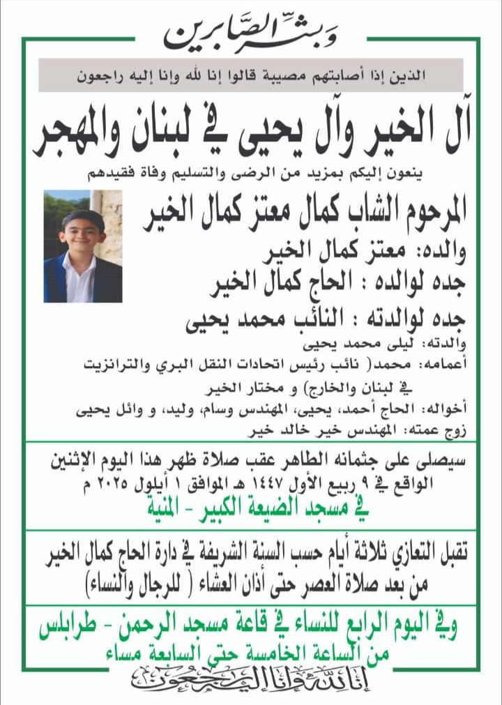 ببالغ الحزن والأسى، فُجعت بلدة المنية وأهالي الشمال بوفاة، الشاب كمال معتز كمال الخير، الذي خطفه الموت باكرًا، إثر حادث أليم على متن دراجة نارية.