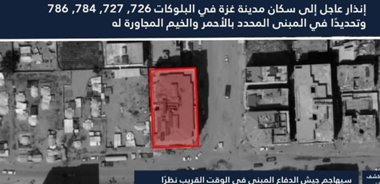 قال المتحدث باسم الجيش الإسرائيليّ أفيخاي أدرعي: “إنذار عاجل إلى سكان مدينة غزة في البلوكات 726, 727, 784, 786 وتحديدًا في عمارة الرؤيا المحددة بالأحمر والخيم المجاورة لها والواقعة عند مفرق بيروت وشارع جامعة الدول العربية”.
