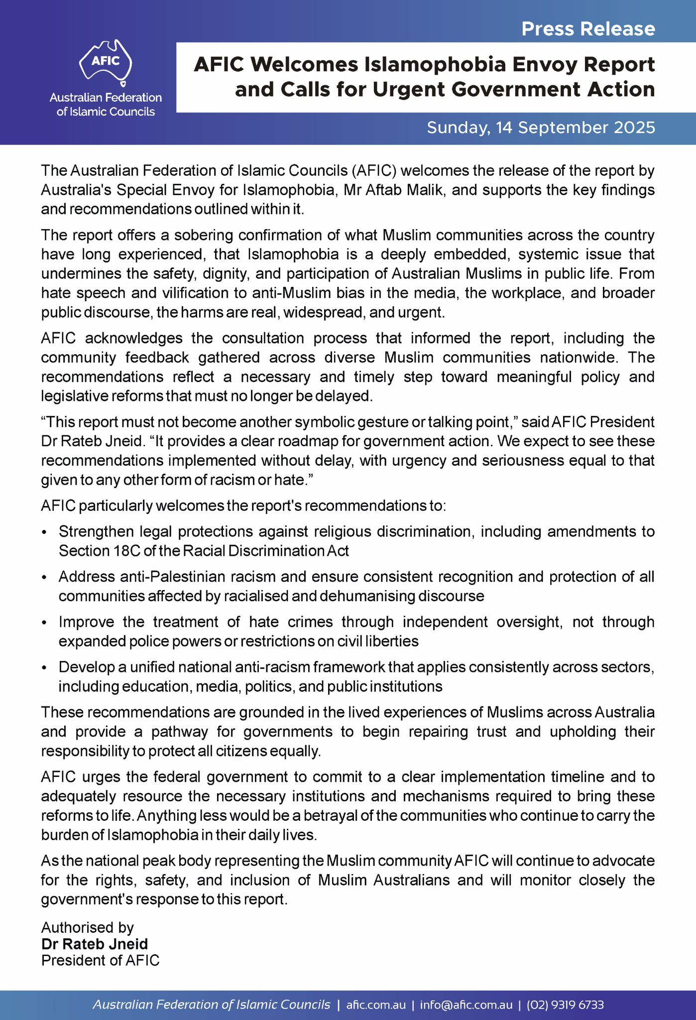 The Australian Federation of Islamic Councils (AFIC) welcomes the release of the report by Australia’s Special Envoy for Islamophobia, Mr Aftab Malik, and supports the key findings and recommendations outlined within it.