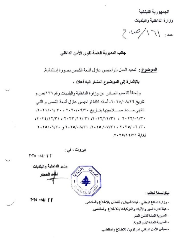 مددت وزارة الداخلية والبلديات العمل بتراخيص عازل أشعة الشمس بصورة إستثنائية وذلك لغاية 31/12/2025.