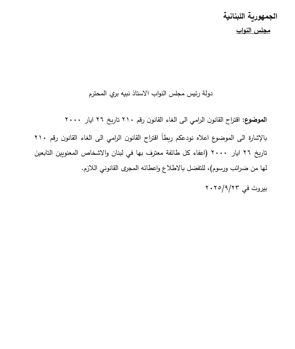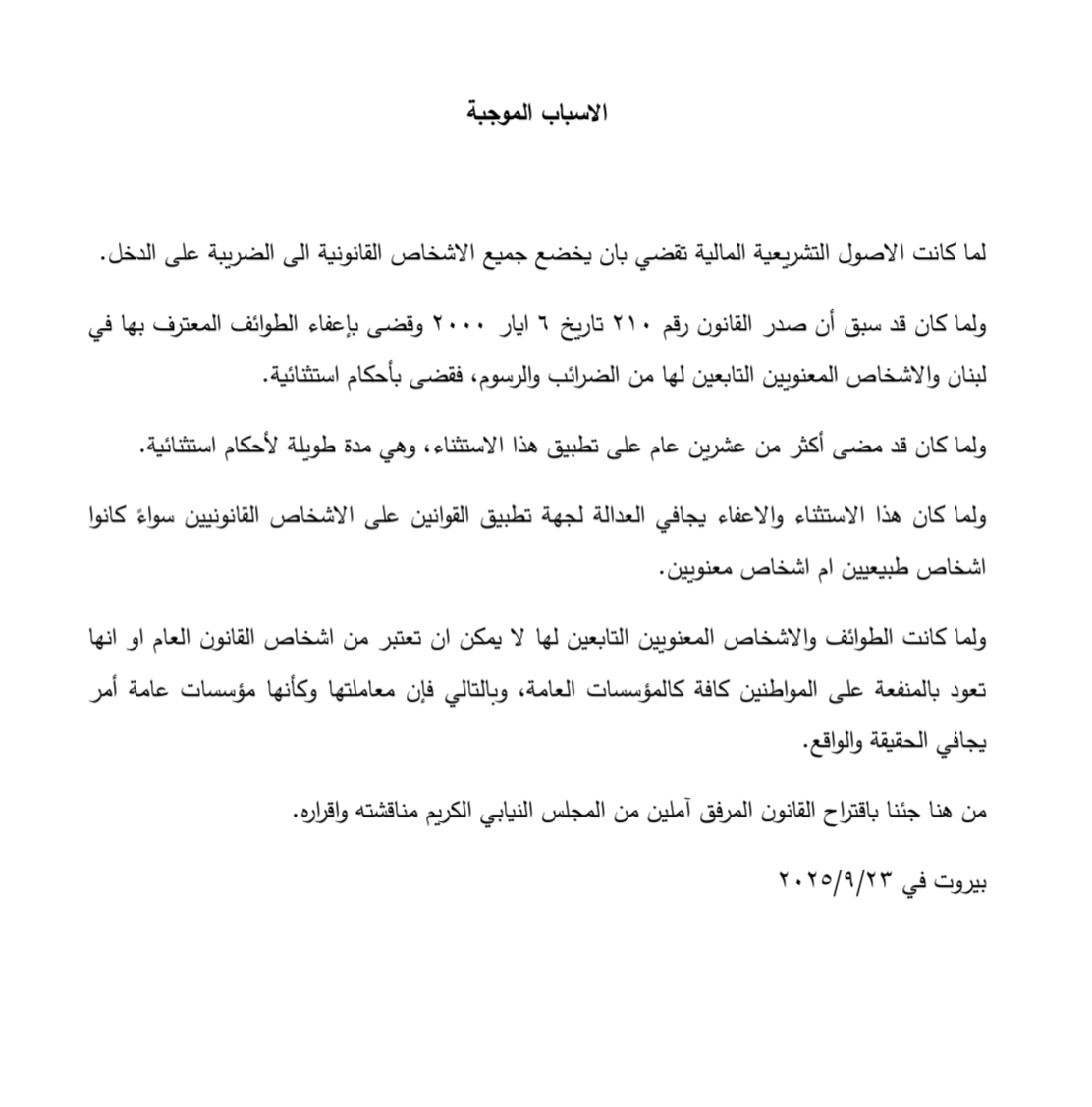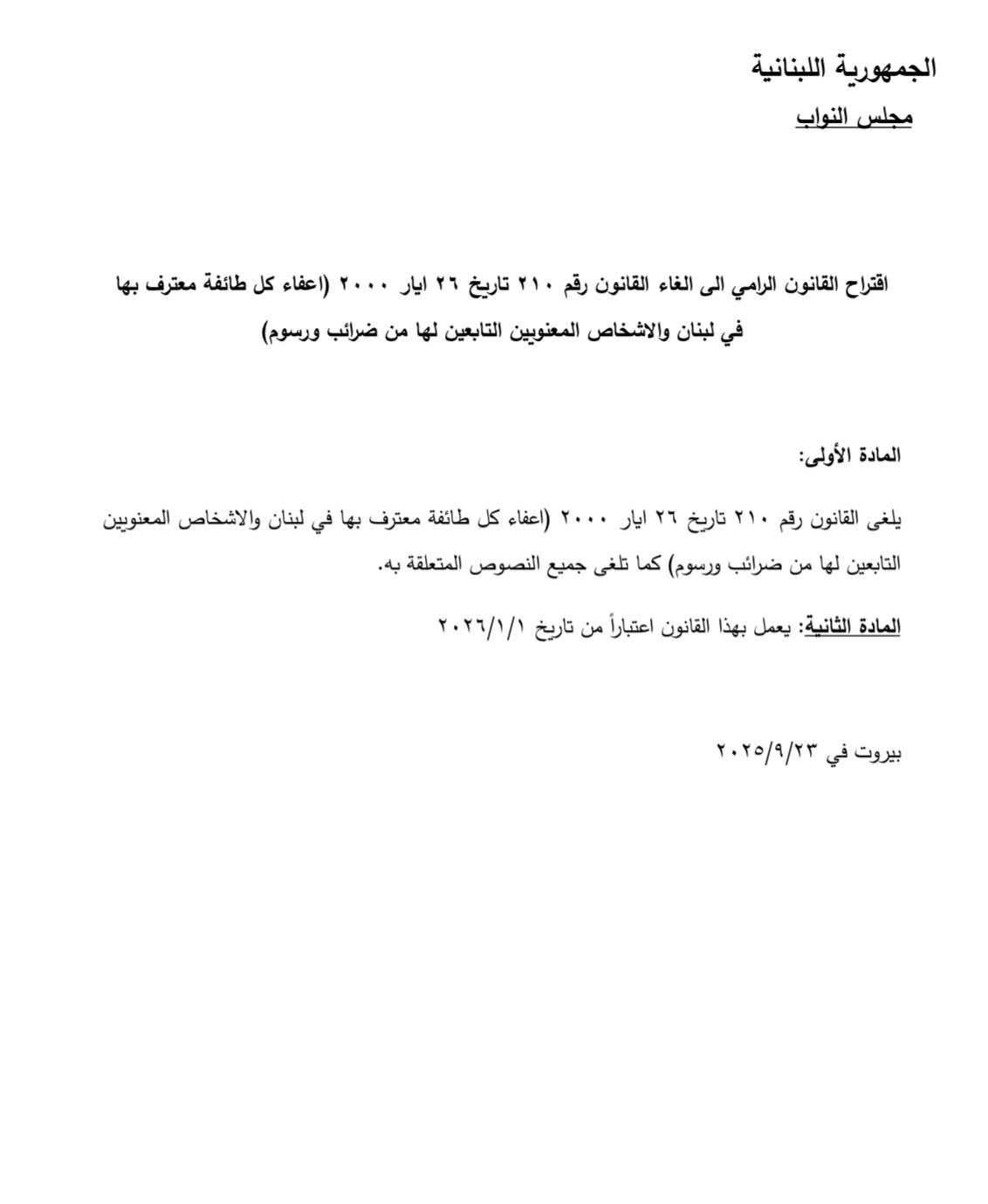قدم النائب بلال عبدالله اقتراح قانون الى المجلس النيابي لإلغاء الإعفاءات الضريبية الممنوحة للطوائف المعترف بها في لبنان.
