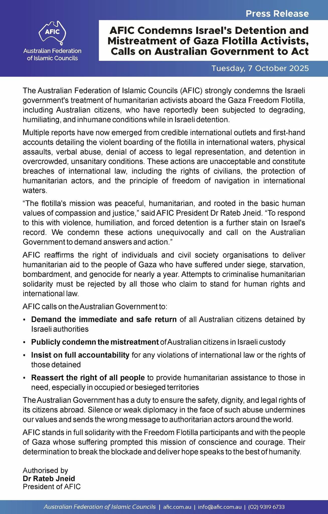 The Australian Federation of Islamic Councils (AFIC) strongly condemns the Israeli government’s treatment of humanitarian activists aboard the Gaza Freedom Flotilla, including Australian citizens, who have reportedly been subjected to degrading, humiliating, and inhumane conditions while in Israeli detention.