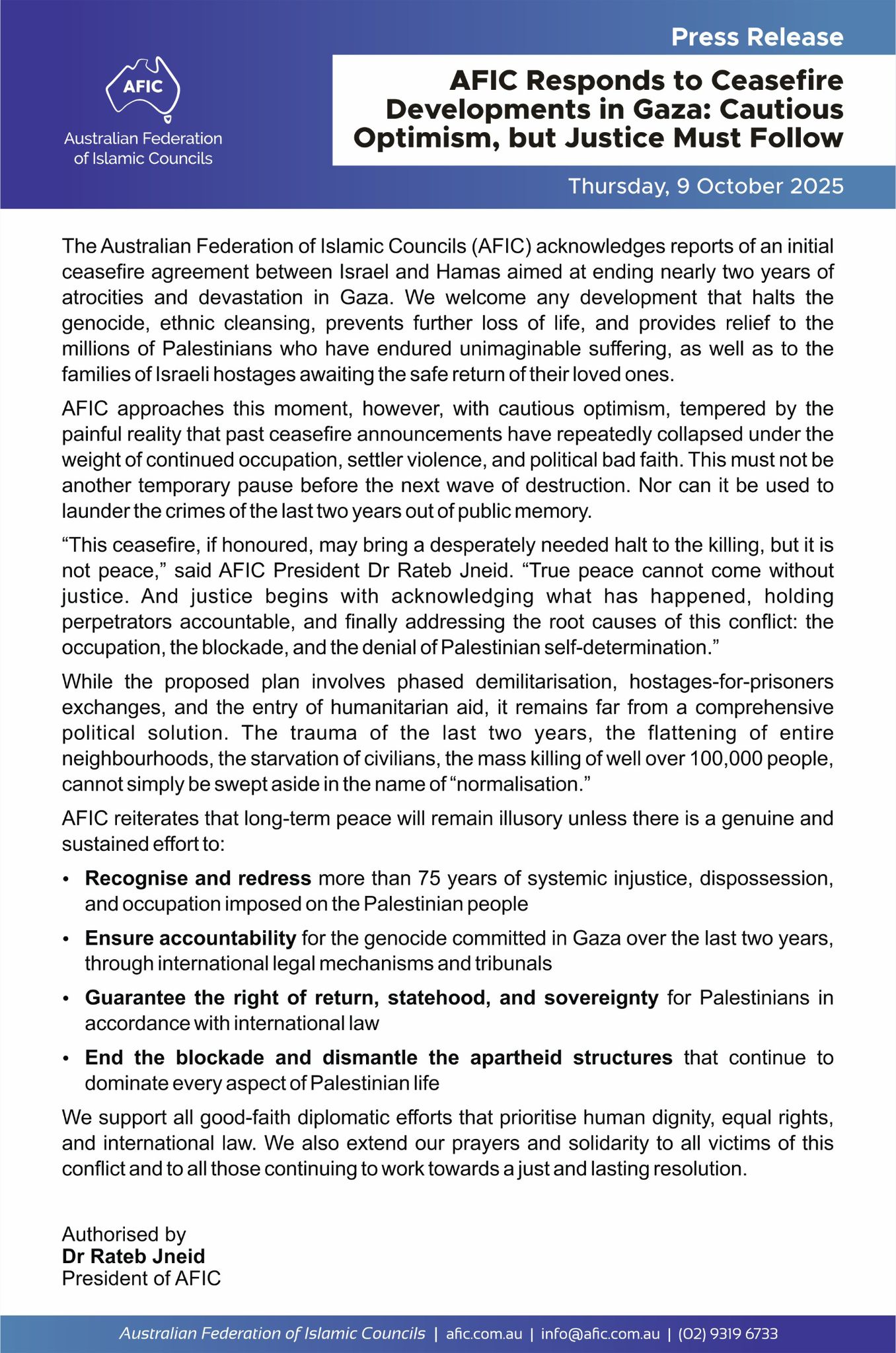The Australian Federation of Islamic Councils (AFIC) acknowledges reports of an initial ceasefire agreement between Israel and Hamas aimed at ending nearly two years of atrocities and devastation in Gaza. We welcome any development that halts the genocide, ethnic cleansing, prevents further loss of life, and provides relief to the millions of Palestinians who have endured unimaginable suffering, as well as to the families of Israeli hostages awaiting the safe return of their loved ones.