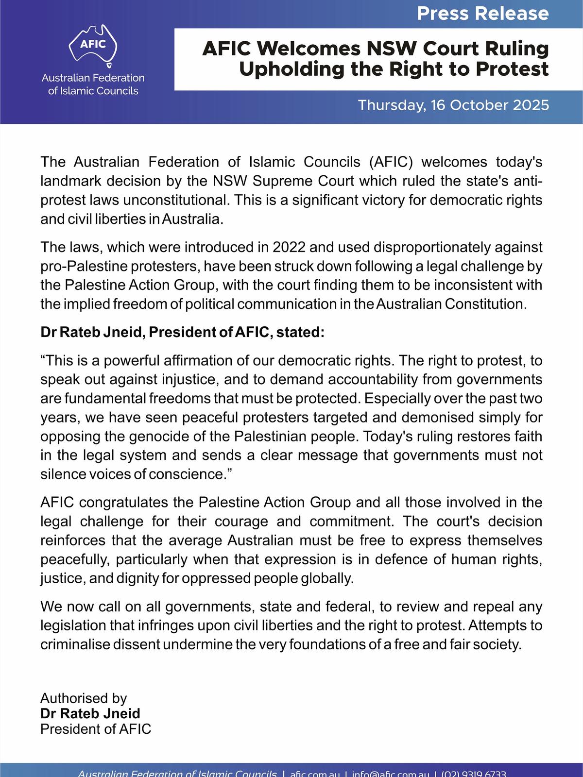 The Australian Federation of Islamic Councils (AFIC) welcomes today’s landmark decision by the NSW Supreme Court which ruled the state’s anti-protest laws unconstitutional. This is a significant victory for democratic rights and civil liberties in Australia.