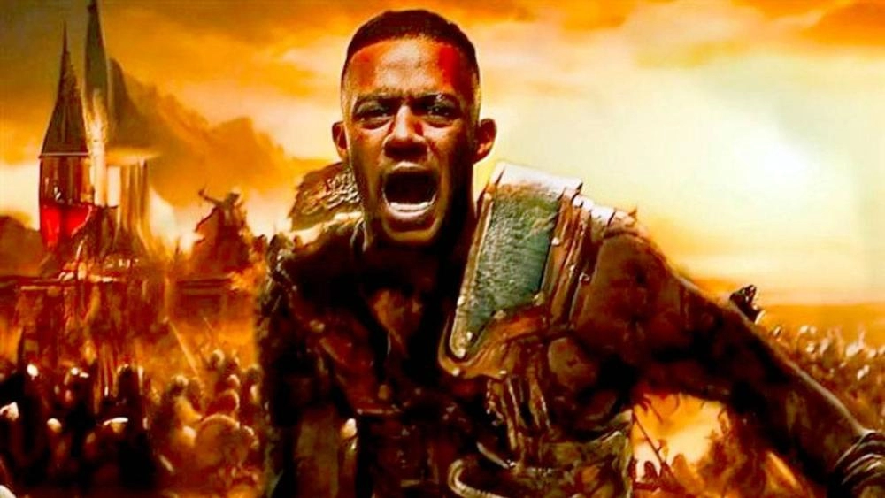 ويظهر محمد رمضان في الملصق الدعائي من الخلف وهو مُكبَّل بالقيود الحديدية، واقفًا على قمة جبل يطل على القاهرة الأيوبية التي تتصاعد منها ألسنة الدخان والحرائق.