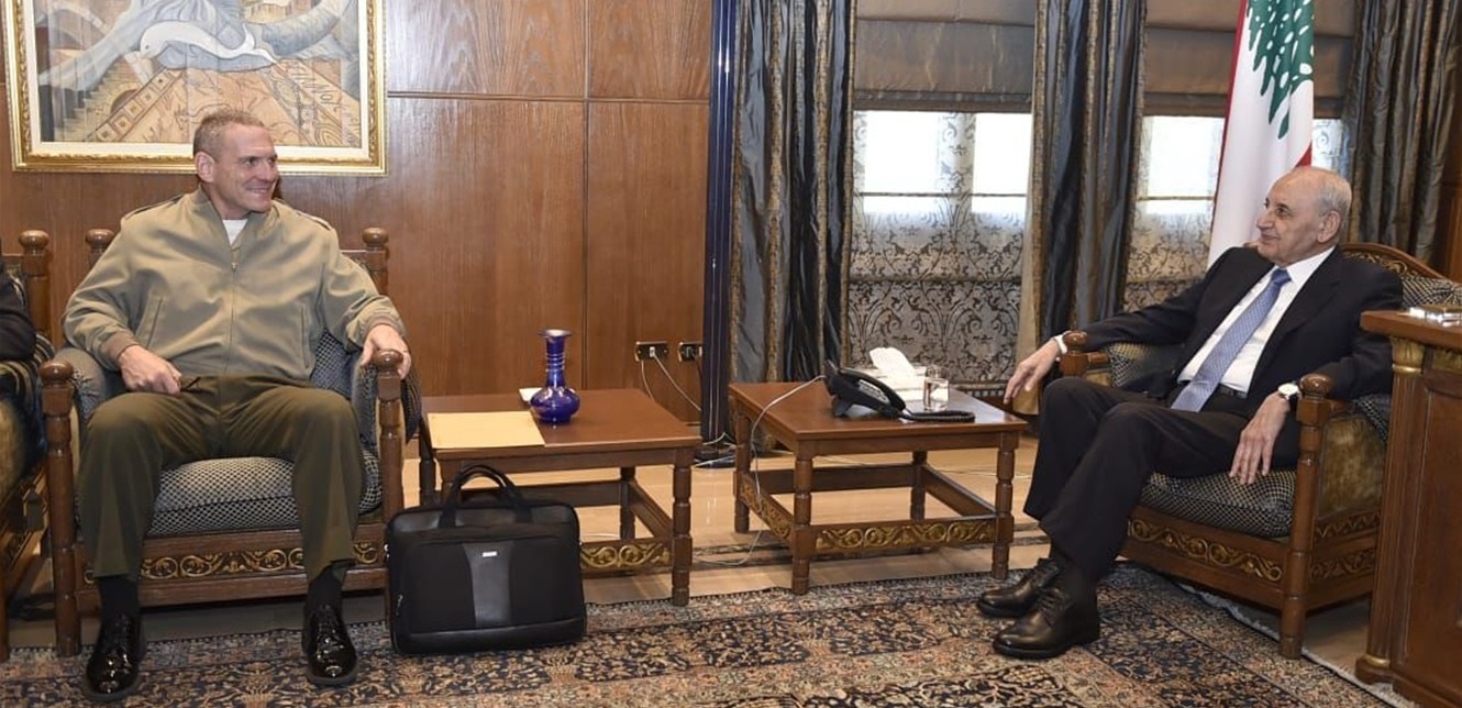 تابع رئيس مجلس النواب نبيه بري الأوضاع الميدانية خلال استقباله رئيس لجنة مراقبة وقف إطلاق النار (Mechanism) الجنرال الأميركي جوزيف كليرفيلد والوفد العسكري المرافق، بحضور القائم بأعمال السفارة الأميركية في لبنان كيث هانيغان والمستشار الإعلامي لرئيس المجلس علي حمدان.