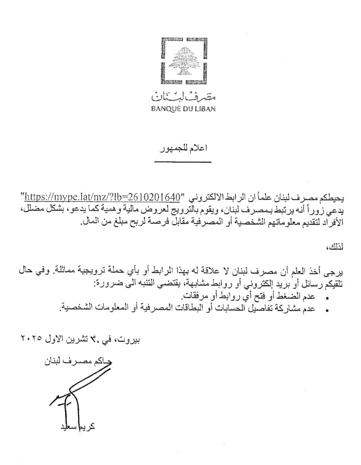 واكد البيان أن “مصرف لبنان لا علاقة له بهذا الرابط أو بأي حملة ترويجية مماثلة. وفي حال تلقيكم رسائل أو بريد إلكتروني أو روابط مشابهة، يقتضي التنبه إلى ضرورة عدم الضغط أو فتح أي روابط أو مرفقات. وعدم مشاركة تفاصيل الحسابات أو البطاقات المصرفية أو المعلومات الشخصية”.