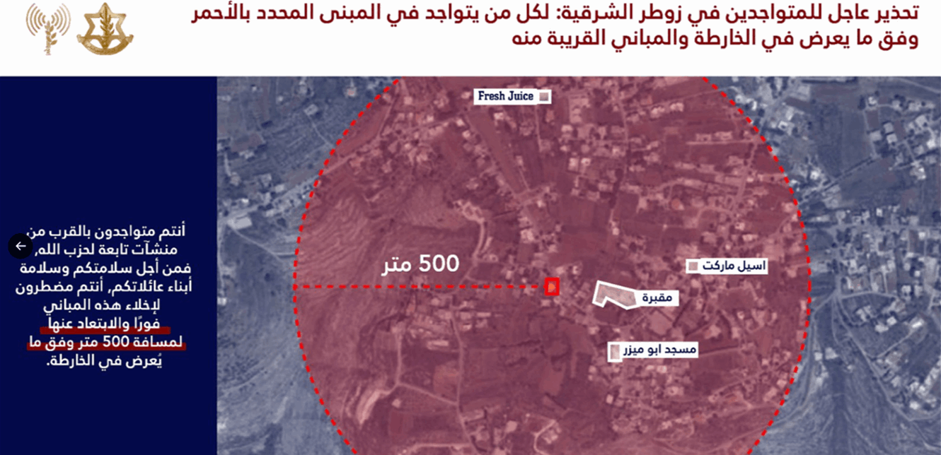 وجّه المتحدث بإسم الجيش الإسرائيلي أفيخاي أدرعي إنذارا عاجلا إلى سكان جنوب لبنان وتحديدًا في زوطر الشرقية، وفق ما تشير إليه الصور أدناه.