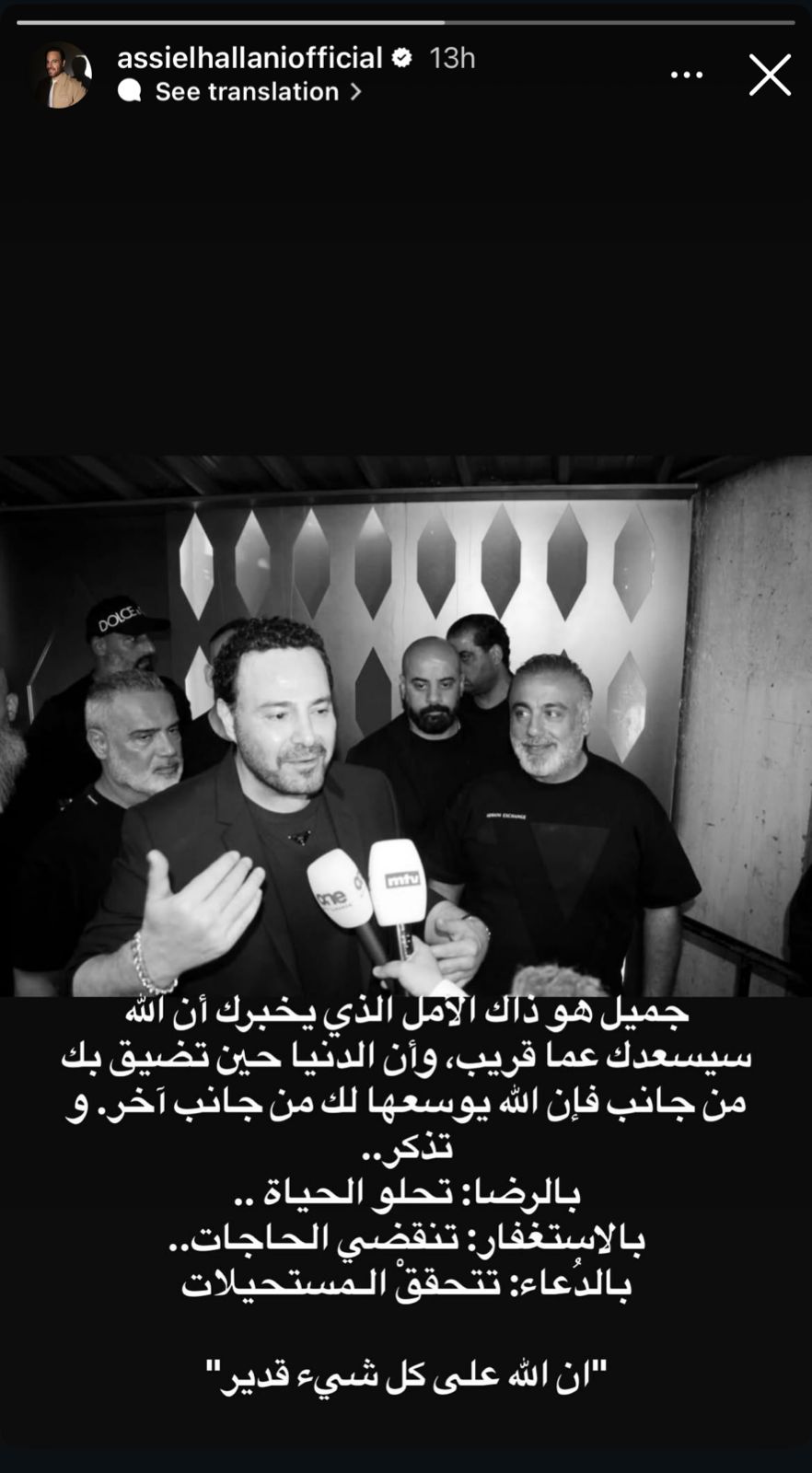 نشر الفنان عاصي الحلاني رسالة مؤثرة عبر خاصية القصص في إنستغرام، عبّر فيها عن تفاؤله وإيمانه بأن الفرج قريب مهما اشتدت الصعاب.