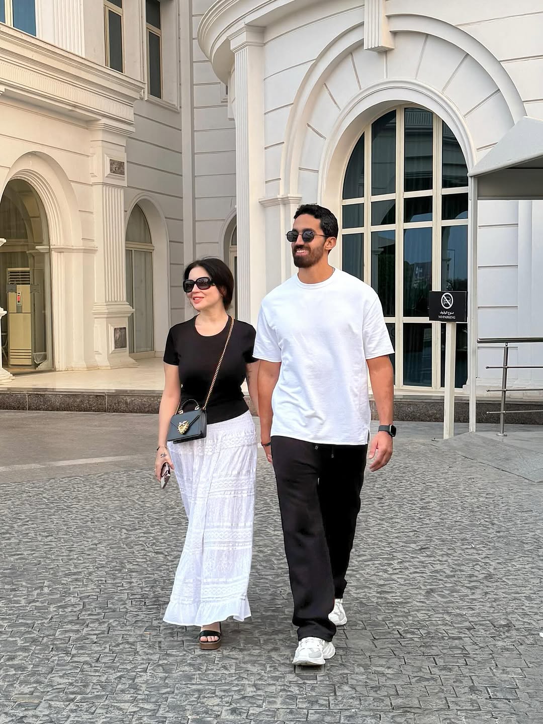 وارتدت مي تنورة بيضاء مع قميص أسود ونظارة شمسية، فيما اختار تيمور إطلالة كلاسيكية بقميص أبيض وسروال أسود.