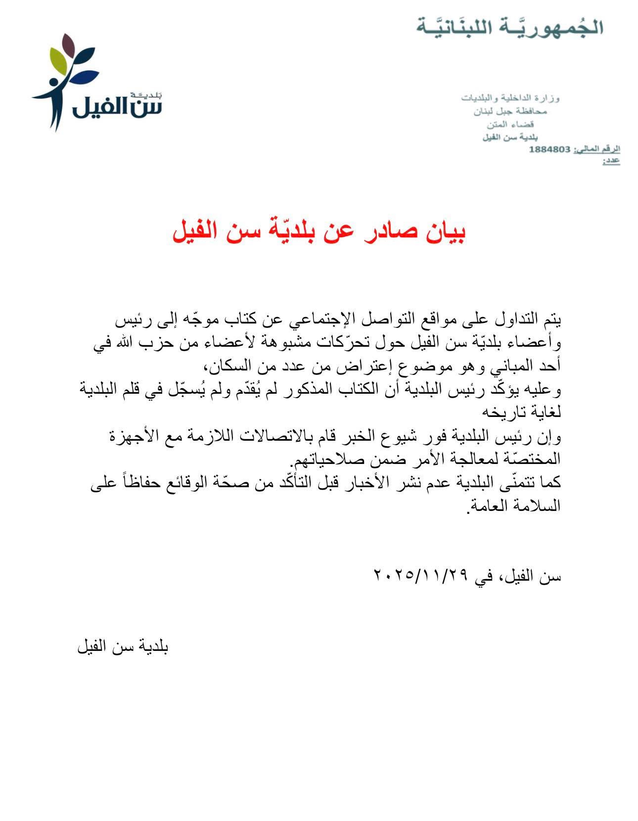 بدورها، أصدرت بلدية سن الفيل بياناً قالت فيه إن الكتاب المذكور لم يُقدم ولم يُسجل في قلم البلدية لغاية تاريخ 29 تشرين الثاني 2025، مشيرة إلى أن رئيس البلدية وفور شيوع الخبر، قام بالاتصالات اللازمة مع الأجهزة المختصة لمعالجة الأمر ضمن صلاحياتهم.