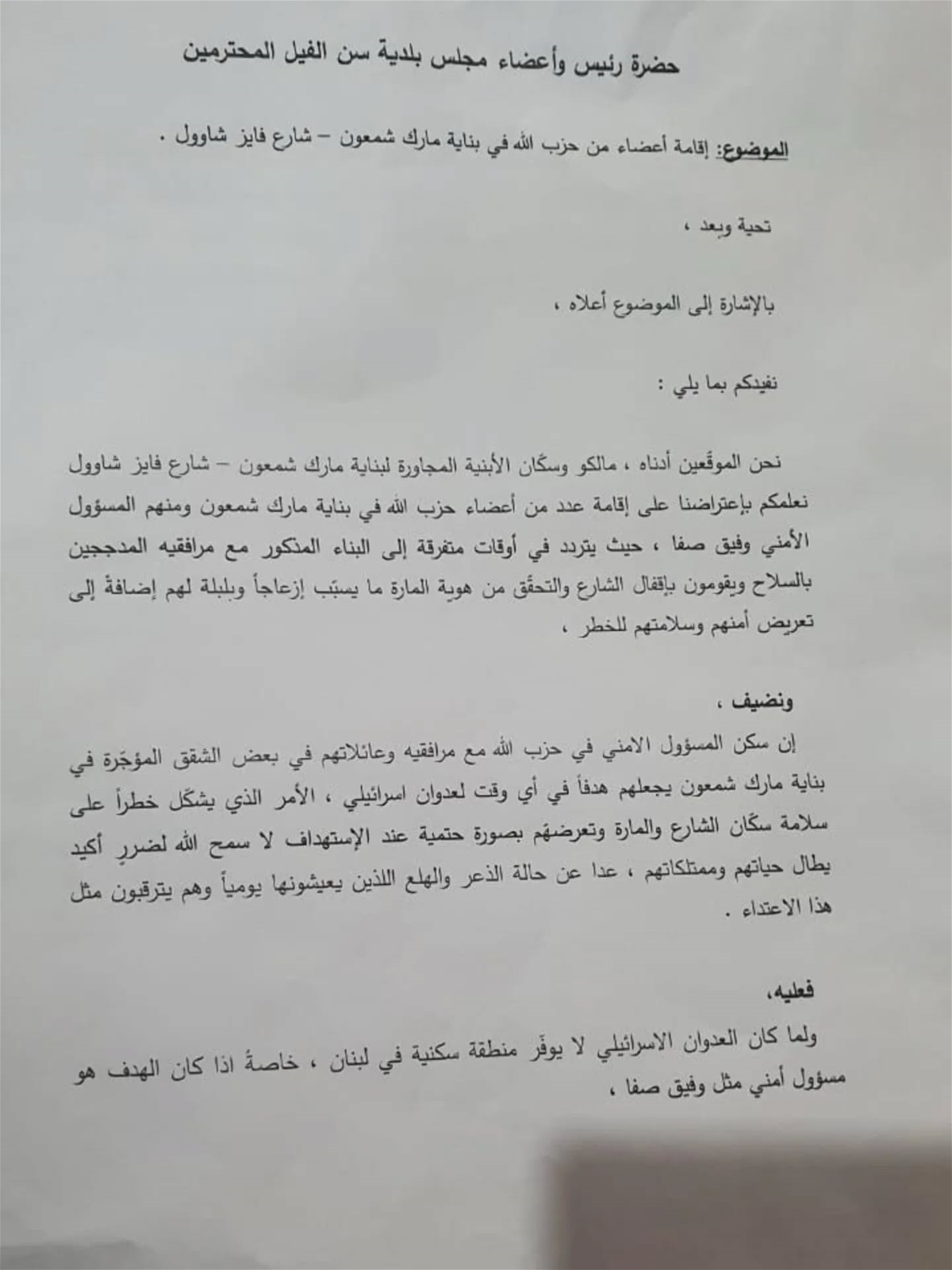 ويشير الكتاب إلى أنّ سكن صفا ومرافقيه وعائلاتهم في بعض الشقق المؤجرة في مبنى مارك شمعون، يجعلهم هدفاً في أي وقت لعدوان إسرائيلي، الأمر الذي يُشكل خطراً على سلامة سكان الشارع والمارة ويعرضهم بصورة حتمية عند أي استهداف لضرر أكيد يطال حياتهم وممتلكاتهم.