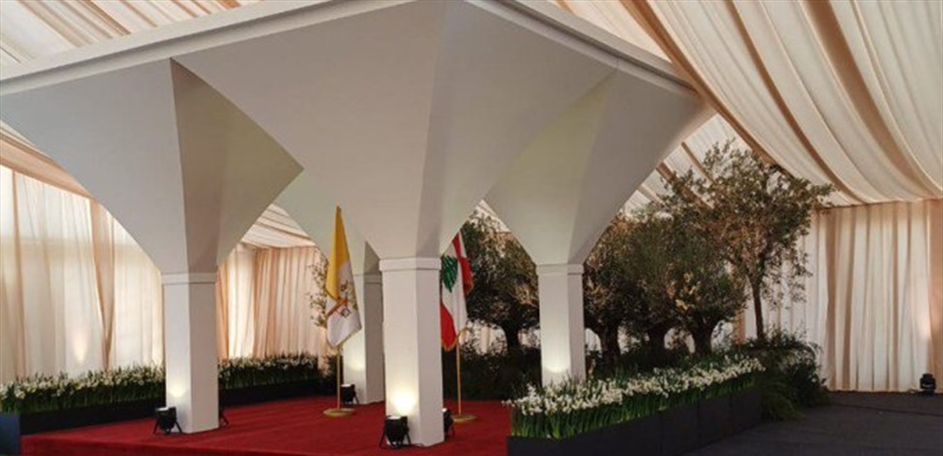 وتمّ تزيين المبنى والمنصة حيث سيقف البابا ورئيس الجمهورية العماد جوزف عون بزهرة النارسيس الفريدة التي ترمز إلى الرجاء والتجدّد، إضافة الى أشجار الزيتون، وفرشت الأرض بالسجاد الأحمر.