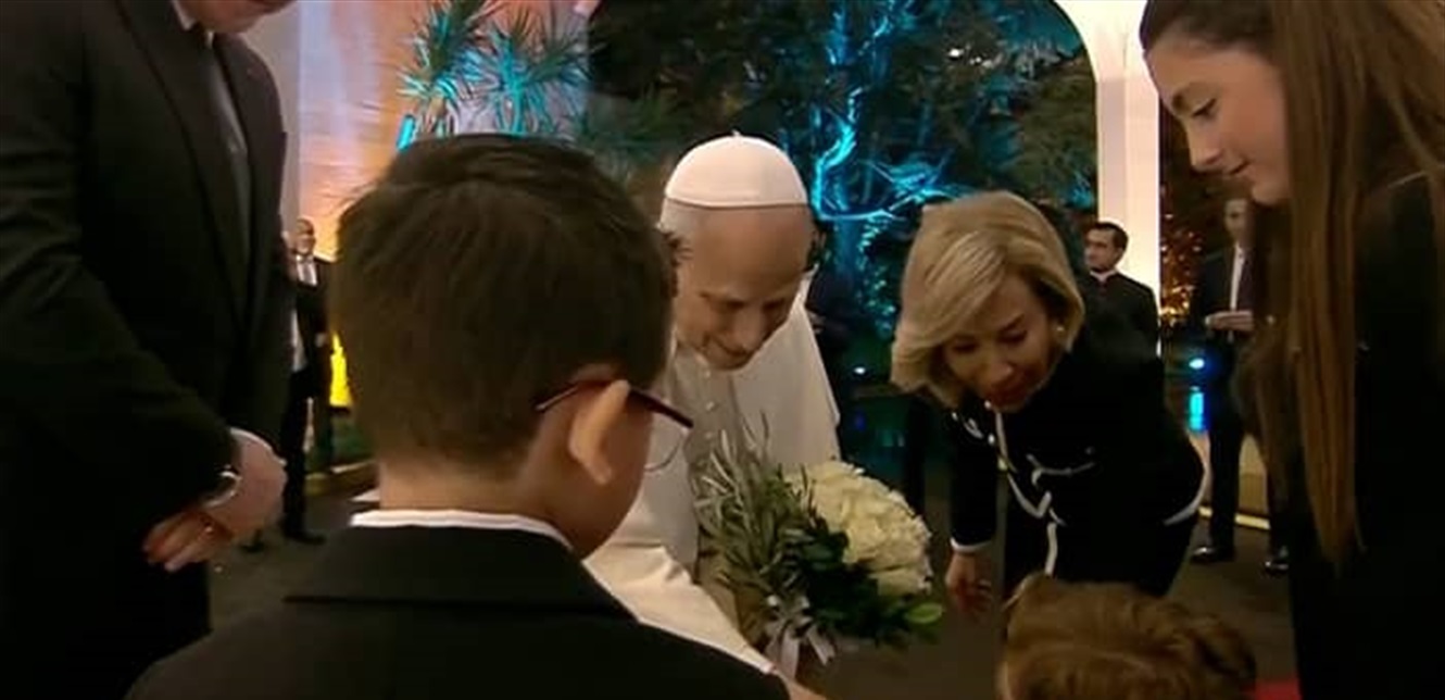 استقبل أحفاد رئيس الجمهورية العماد جوزيف عون، البابا لاوون الرابع عشر عند مدخل القصر الجمهوري، حيث قدّموا له باقة من الورود وقصفة زيتون، في رمزية عبّرت عن الترحيب والسلام بقداسته.