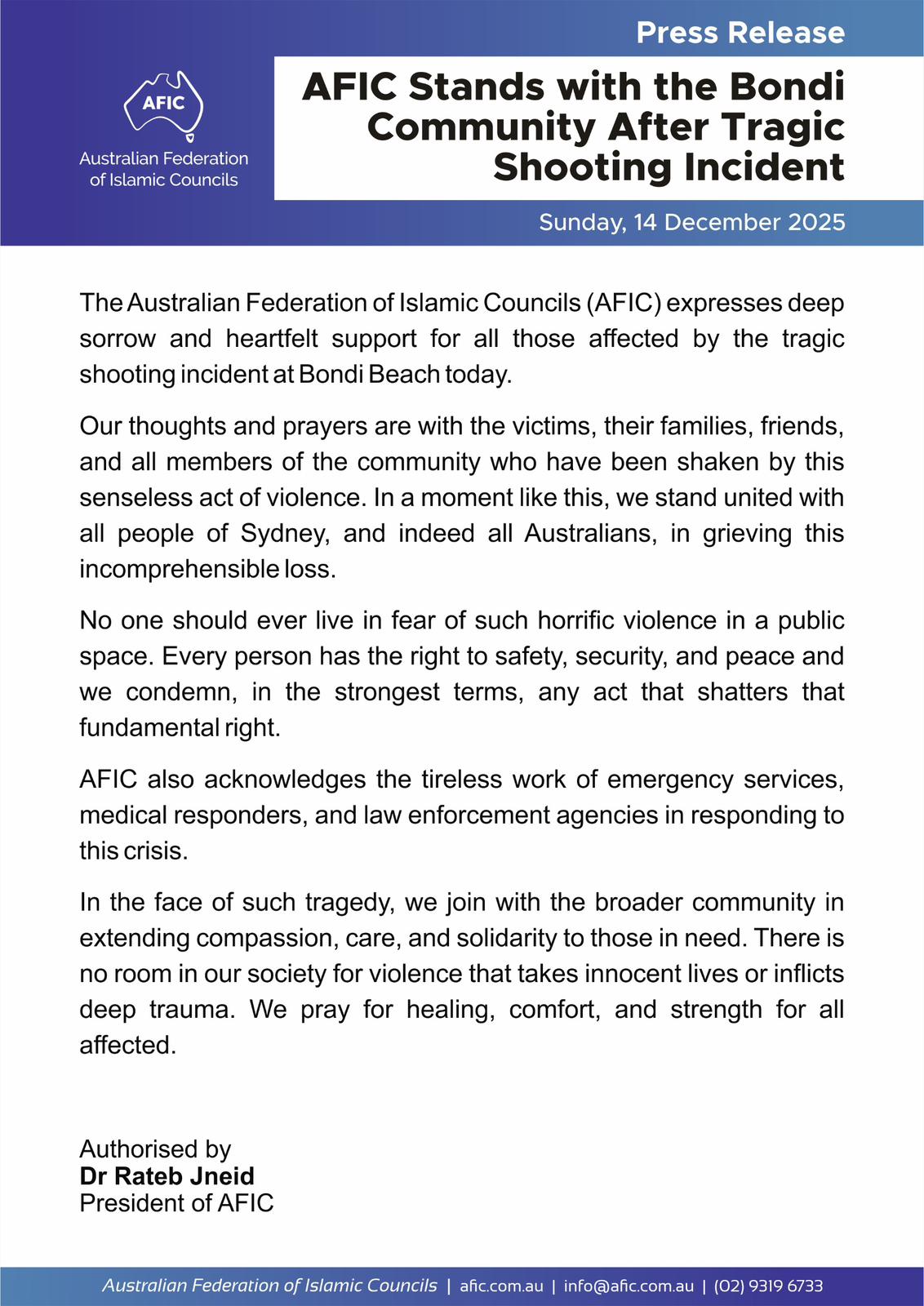 The Australian Federation of Islamic Councils (AFIC) expresses deep sorrow and heartfelt support for all those affected by the tragic shooting incident at Bondi Beach today.