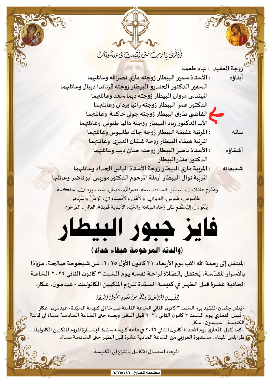 يُحتفل بالصلاة لراحة نفسه يوم السبت 3 كانون الثاني 2026 عند الساعة 11:00 من قبل الظهر في كنيسة السيدة للروم الملكيين الكاثوليك في بلدة عيدمون – عكار ثم يوارى الثرى في مدافن العائلة.