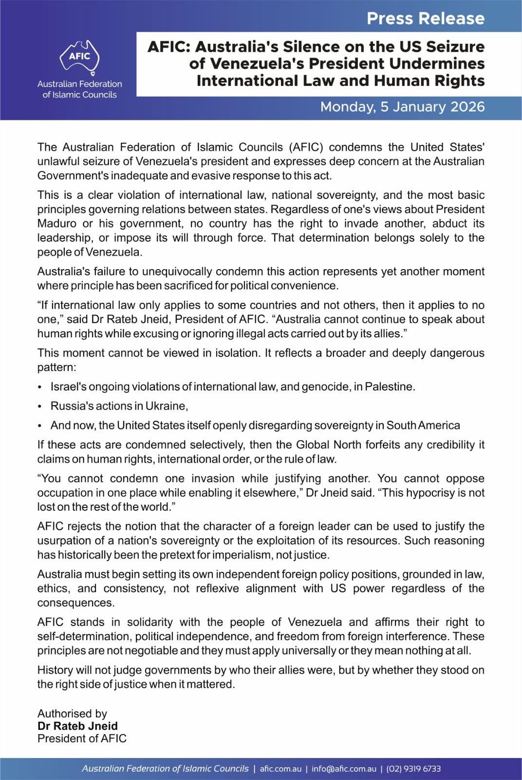 The Australian Federation of Islamic Councils (AFIC) condemns the United States’ unlawful seizure of Venezuela’s president and expresses deep concern at the Australian Government’s inadequate and evasive response to this act.