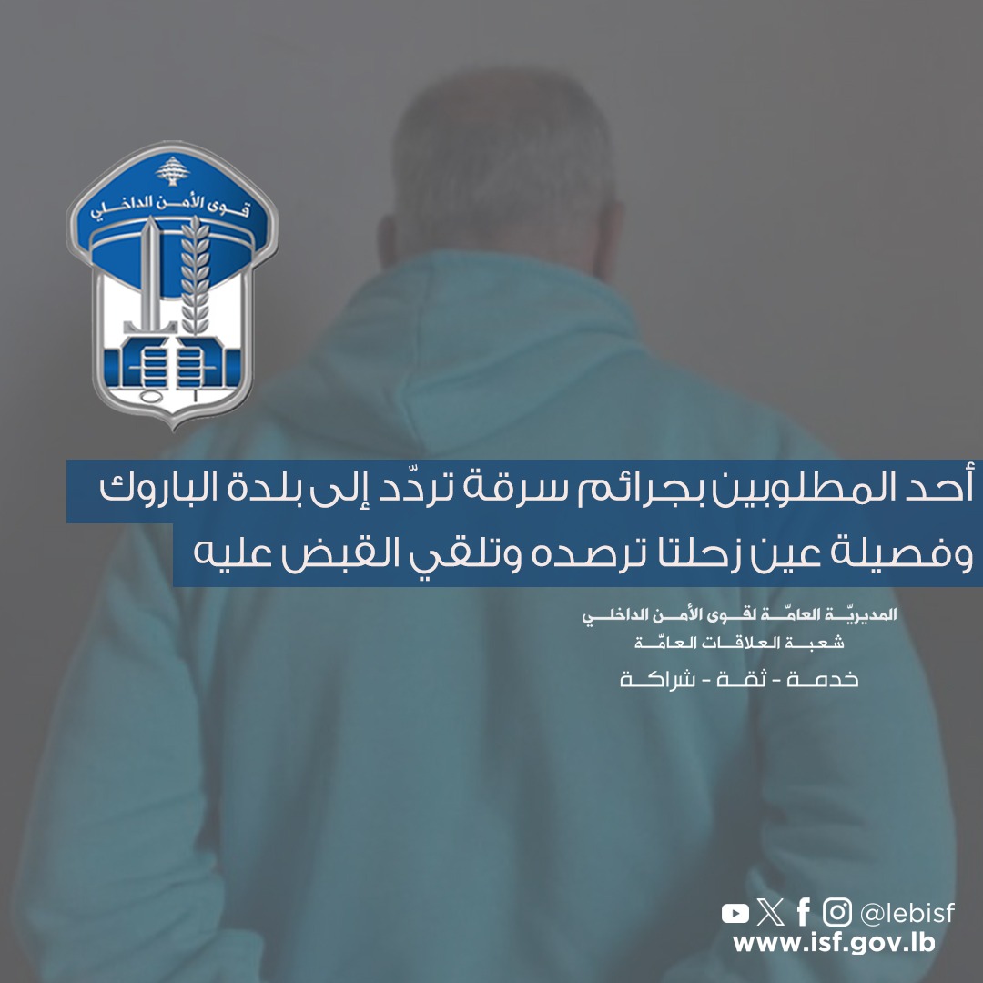 قوى الأمن الداخلي لملاحقة المطلوبين للقضاء وتوقيفهم، وبناءً على معلومات توافرت لدى فصيلة عين زحلتا ضمن سرية بيت الدين في وحدة الدرك الإقليمي حول وجود أحد المطلوبين في محلة الباروك وتردّده إلى محل إقامة اتّخذه فيها، وبنتيجة المتابعة، تمّ تحديد مكان وجوده وكشف هويّته، ويدعى – ر. ح. (مواليد عام 1974، لبناني) بتاريخ 8-1-2026، قامت قوّة من الفصيلة بمداهمة المكان المذكور وتوقيفه، حيث تبيّن أنّه مطلوب للقضاء بموجب /4/ ملاحقات عدلية بجرائم سرقة”.