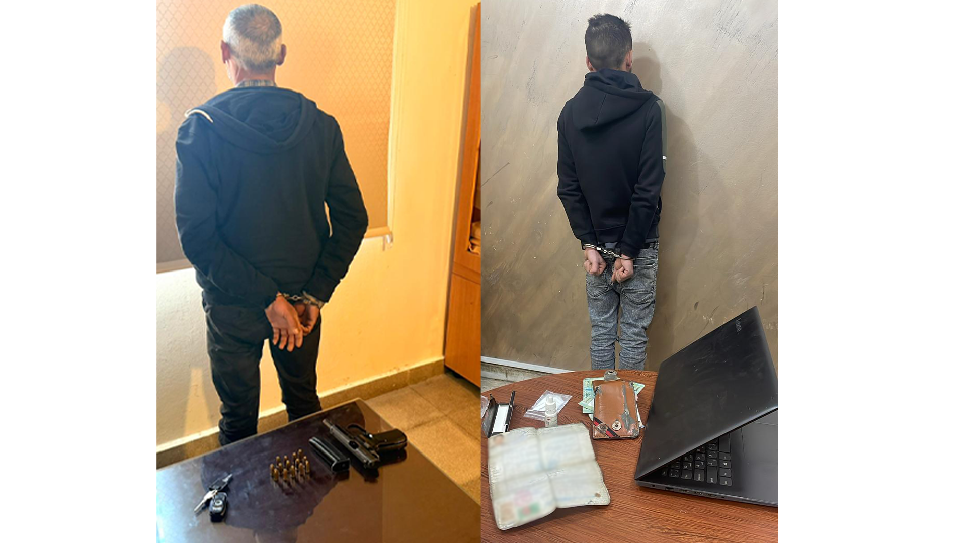 بتفتيشه، عُثر بحوزته على مسدّس حربي مع /14/ طلقة صالحة للاستعمال وهاتف خلوي.