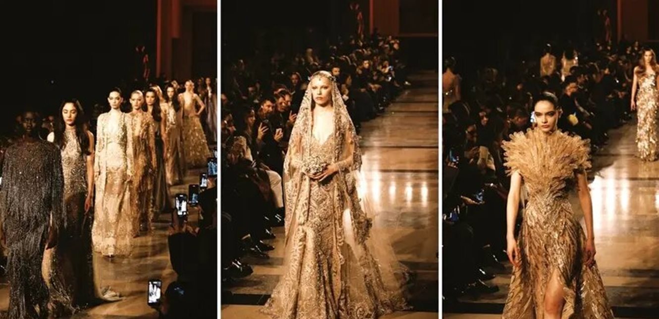 أطلق إيلي صعب في قصر “شايو” مجموعة مذهبة ضمت حوالي 55 إطلالة استحضرت ثقافة الترف والبذخ التي سادت في سبعينيات القرن الماضي، ممتزجة بالطابع البوهيمي المريح وروح مدينة مراكش، حيث طغت التدرجات المعدنية من الذهبي والبرونزي والفضي العتيق لتشكل توهجاً يستحضر ضوء الشمس، معتمداً على تطريز هندسي وزخارف من الشيفون استلهمت لمساتها من فن “الأرت ديكو” لتمنح الفساتين أناقة معمارية فاخرة.
