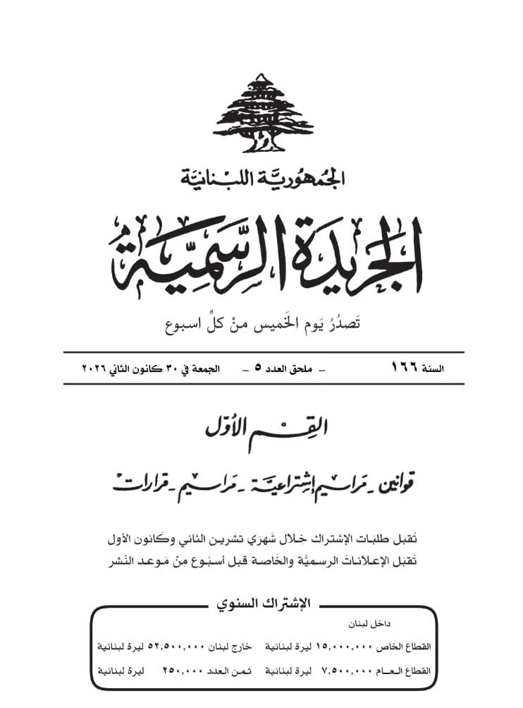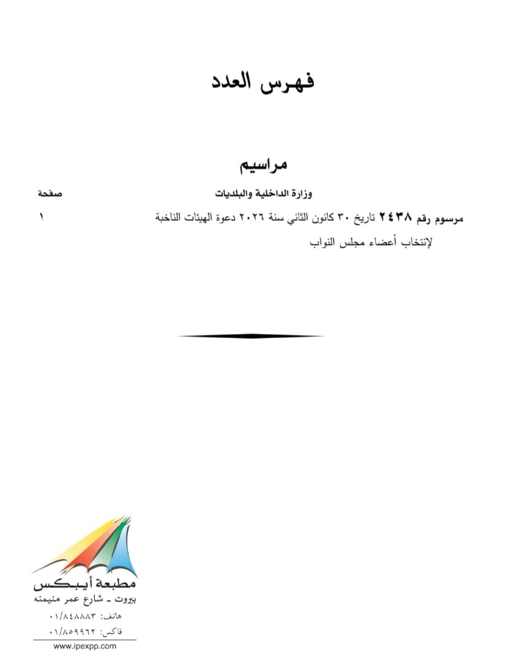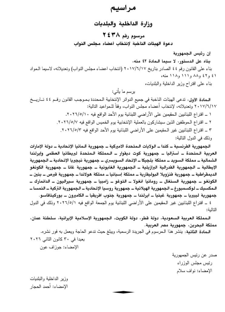 30JAN صدور مرسوم دعوة الهيئات الناخبة في الجريدة الرسمية Share Tweet Share Whatsapp Email صدر مرسوم دعوة الهيئات الناخبة في الجريدة الرسمية في عدد خاص. Related Postsالتصويت على موازنة 2026.. مرآة للتناقض السياسي!.. غسان ريفيفي بلد خليجي.. برشلونة يستثمر شعاره بملايين الدولاراتهاشم : المسار القانوني للانتخابات قائم وفق المهل الدستورية Post Author: SafirAlChamal