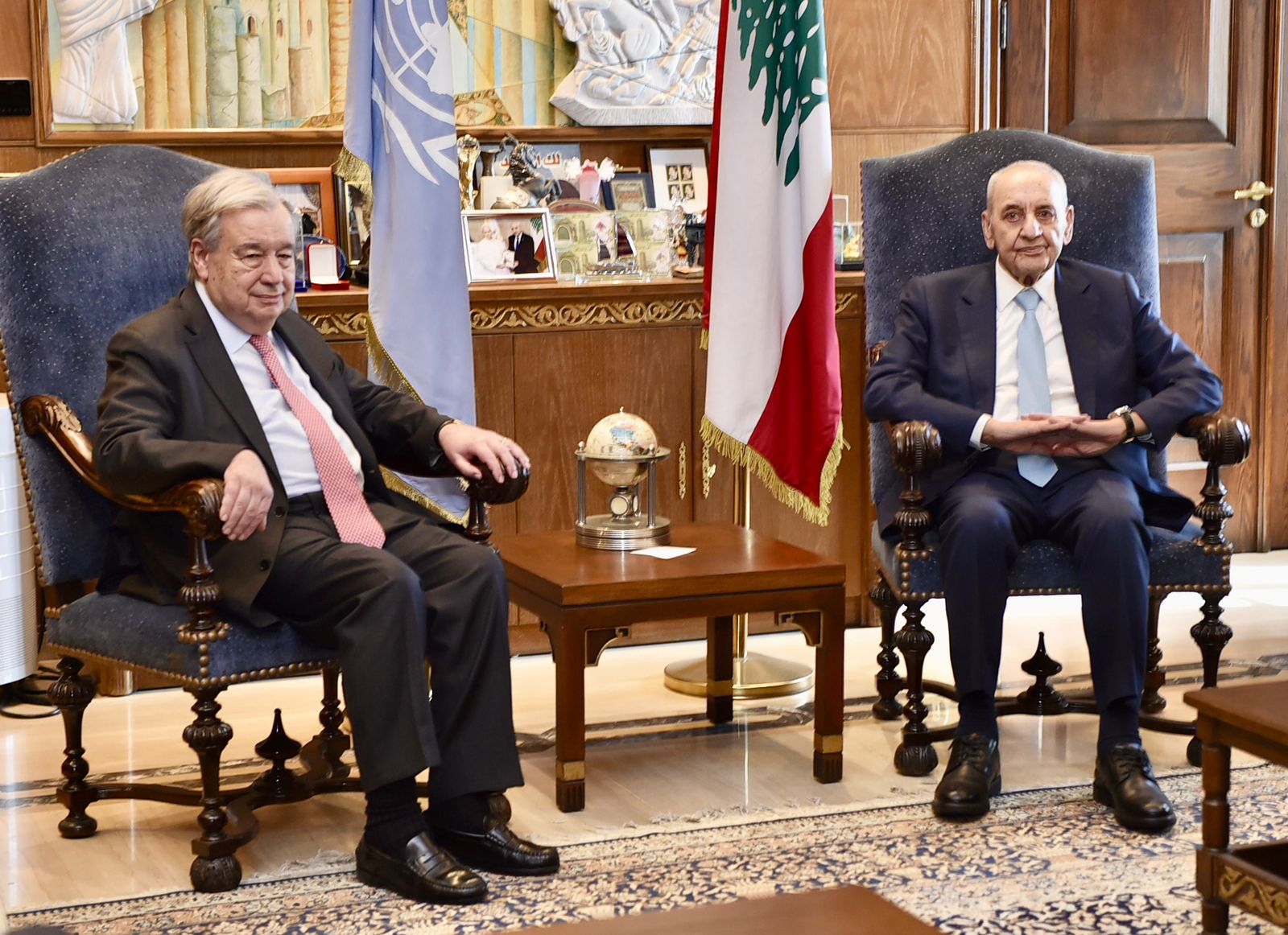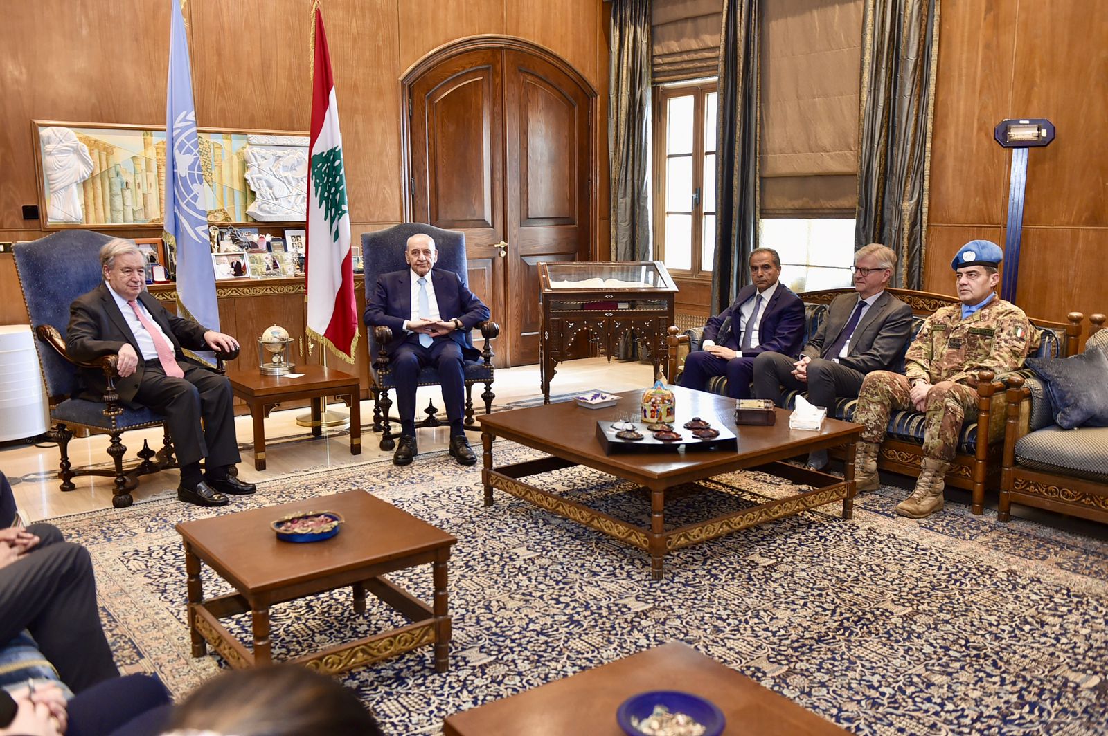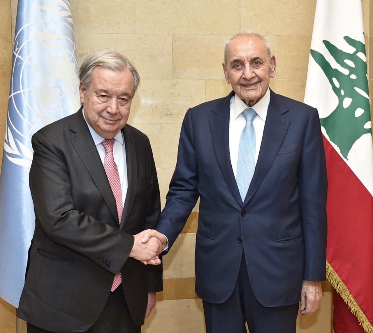 استقبل رئيس مجلس النواب نبيه بري في مقر الرئاسة الثانية في عين التينة الأمين العام للأمم المتحدة أنطونيو غوتيريش والوفد المرافق بحضور، وكيل الأمين العام للأمم المتحدة لعمليات السلام جان بيار لاكروا ، المنسقة الخاصة للأمم المتحدة في لبنان جانين بلاسخارت ، قائد قوات اليونيفيل في لبنان اللواء ديوداتو أبنيارا ، المنسق المقيم للأمم المتحدة في لبنان منسق الشؤون الإنسانية عمران ريزا و المستشار الإعلامي لرئيس مجلس النواب علي حمدان ، حيث تناول اللقاء تطورات الأوضاع العامة في لبنان والمنطقة والمستجدات السياسية والميدانية على ضوء تصاعد العدوان الإسرائيلي على لبنان وتداعياته على كافة المستويات لا سيما ملف النزوح وتهجير مئات آلاف اللبنانيين قسراً عن منازلهم إضافة لدور قوات اليونيفيل وما تتعرض له من إعتداءات إسرائيلية .