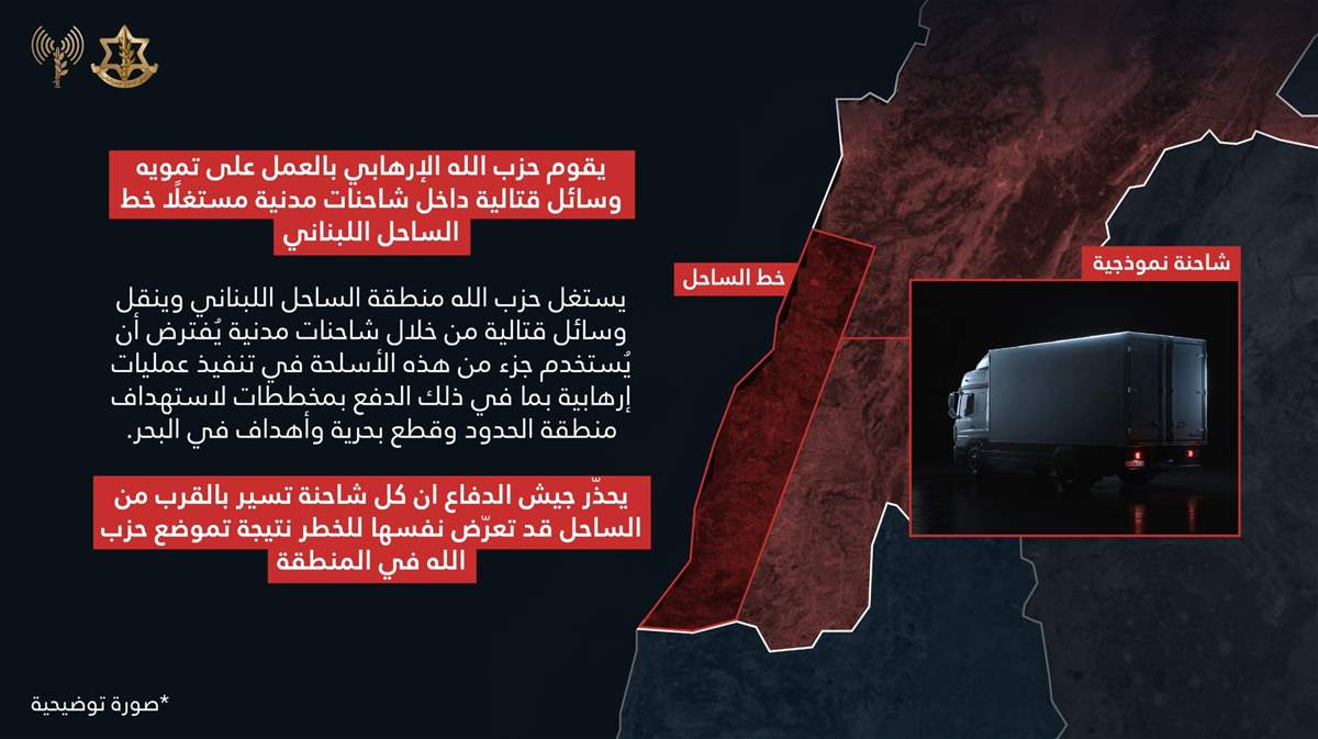 أضاف: “وفقًا لمعلومات استخبارية وصلت إلينا يمكننا الآن الكشف عن قيام حزب الله بالعمل على تمويه وسائل قتالية داخل شاحنات مدنية ويستغل منطقة الساحل اللبناني لنقل وسائل قتالية من خلال شاحنات مدنية”.