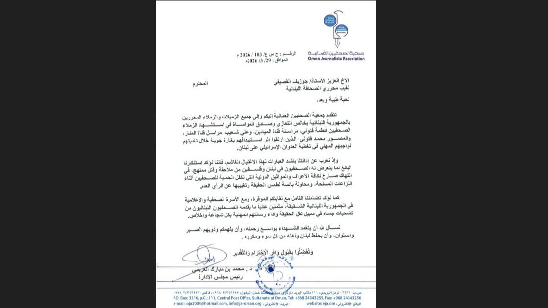 وجاء في نص الرسالة: “إذ نعرب عن إدانتنا بأشد العبارات لهذا الإغتيال الغاشم، فإننا نؤكد استنكارنا البالغ لما يتعرض له الصحافيون في لبنان وفلسطين من ملاحقة وقتل ممنهج، في انتهاك صارخ لكل الأعراف والمواثيق الدولية التي تكفل الحماية للصحافيين أثناء النزاعات المسلحة، ومحاولة بائسة لطمس الحقيقة وتغييبها عن الرأي العام. كما نؤكد تضامننا الكامل مع نقابتكم الموقرة، ومع الأسرة الصحافية والإعلامية في لبنان الشقيق، مثمنين عاليًا ما يقدمه الصحافيون اللبنانيون من تضحيات جسام في سبيل نقل الحقيقة وأداء رسالتهم المهنية بكل شجاعة وإخلاص”.