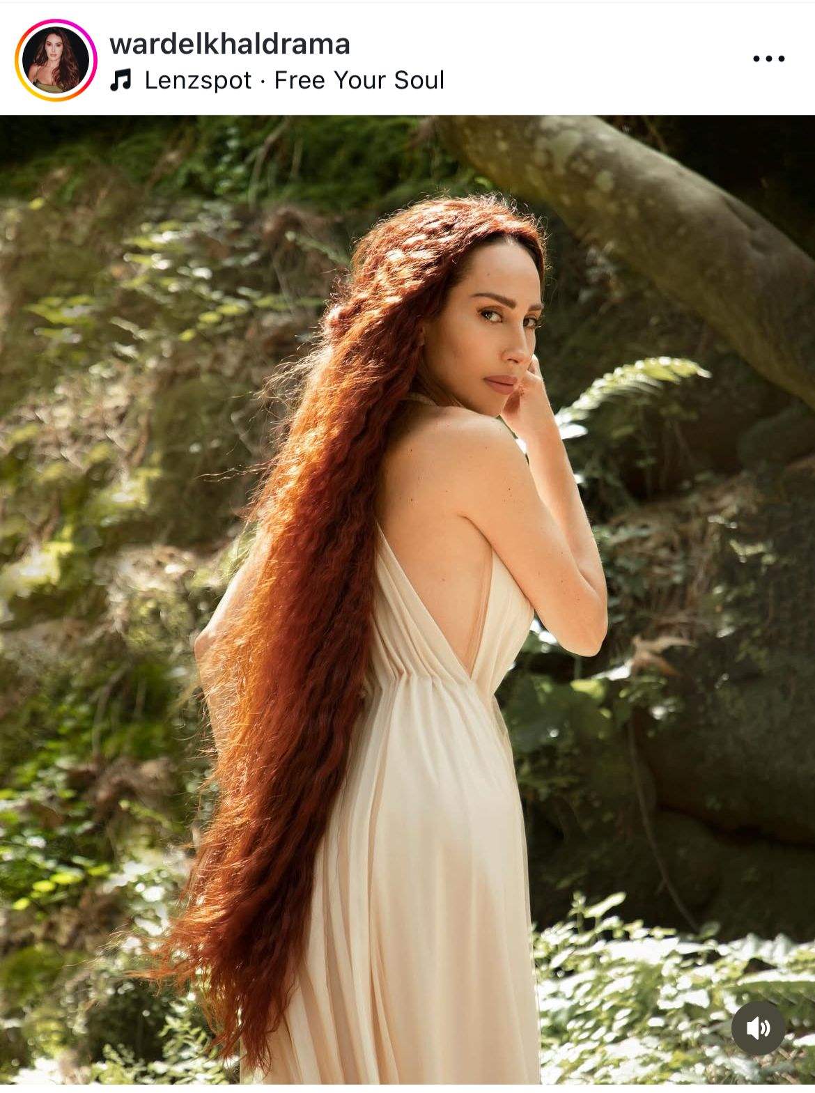 شاركت الممثلة ورد الخال صورة جديدة تظهر فيها بإطلالة بسيطة وأنيقة بفستان أبيض ناعم وشعرها الأحمر الطويل المنسدل حتى الأرض، وسط خلفية طبيعية خضراء تبرز جمالها الطبيعي وأناقتها الهادئة.