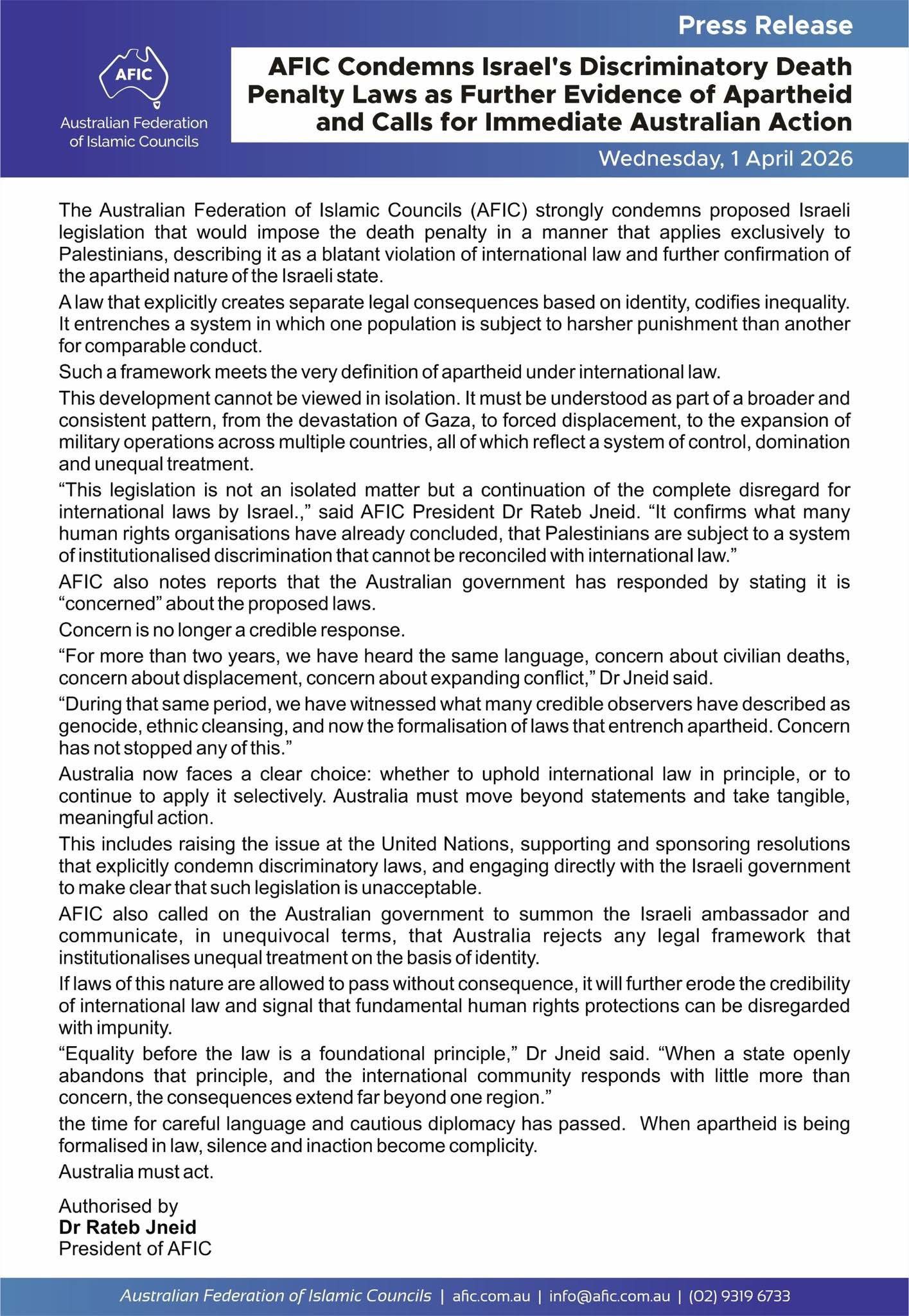 The Australian Federation of Islamic Councils (AFIC) strongly condemns proposed Israeli legislation that would impose the death penalty in a manner that applies exclusively to Palestinians, describing it as a blatant violation of international law and further confirmation of the apartheid nature of the Israeli state.