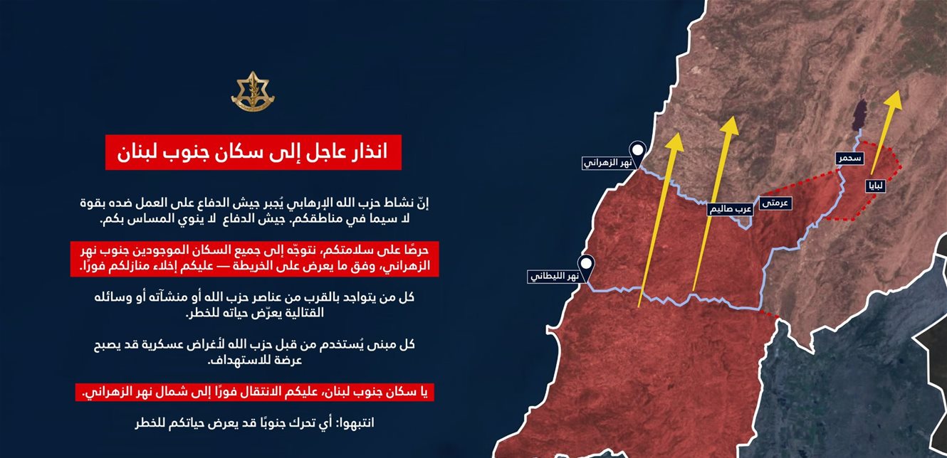 وجه المتحدث باسم الجيش الاسرائيلي افيخاي ادرعي انذاراً عاجلاً إلى سكان جنوب لبنان المتواجدين جنوب نهر الزهراني، زاعماً إن نشاطات حزب الله تُجبر الجيش الاسرائيلي على العمل ضده بقوة في تلك المنطقة وهو لا ينوي المساس بكم.