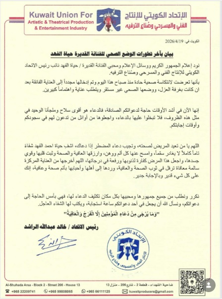 واختُتم البيان بالتشديد على أهمية تكثيف الدعاء للفنانة بالشفاء في هذه المرحلة الحرجة، حيث جاء فيه: “نكرر ونطلب من جميع محبيها وجمهورها تكثيف الدعاء لها، فهي بأمسّ الحاجة الى دعواتكم”.