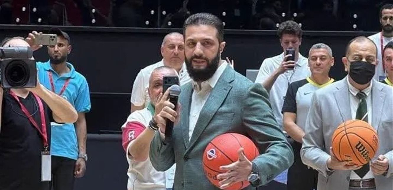 أحمد الشرع لمباراة ودية في كرة السلة بين لبنان وسوريا على أرض ملعب الفيحاء في دمشق.