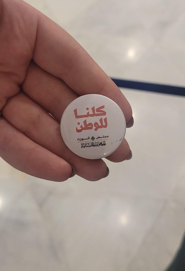 قامت وزيرة الشؤون الإجتماعية حنين السيّد في قصر بعبدا على هامش جلسة مجلس الوزراء، بتوزيع شارات دبابيس “pins” كُتب عليها “كلنا للوطن”.