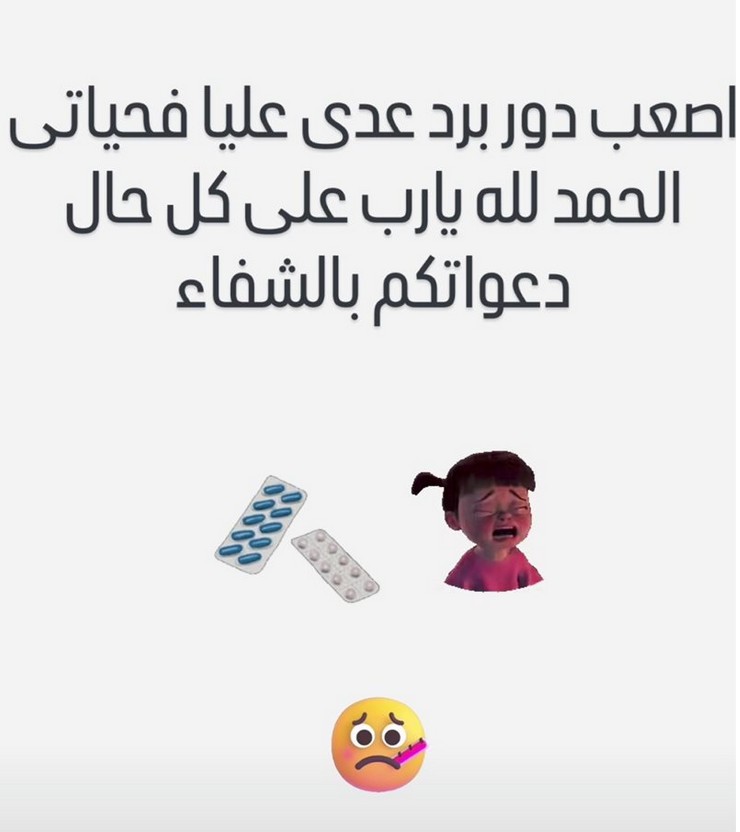 وكتبت شيماء من خلال “ستوري” على حسابها على انستغرام قائلة: “أصعب دور برد عدى عليا في حياتي، الحمد لله يارب على كل حال دعواتكم بالشفاء”.