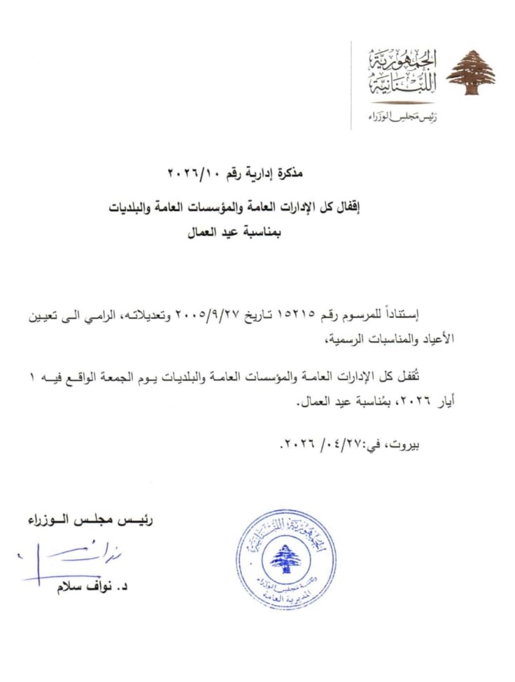 أصدر رئيس مجلس الوزراء نواف سلام، مذكرة بإقفال كافة الإدارات العامة والمؤسسات العامة والبلديات، يوم الجمعة 1 أيار، بمناسبة عيد العمال.