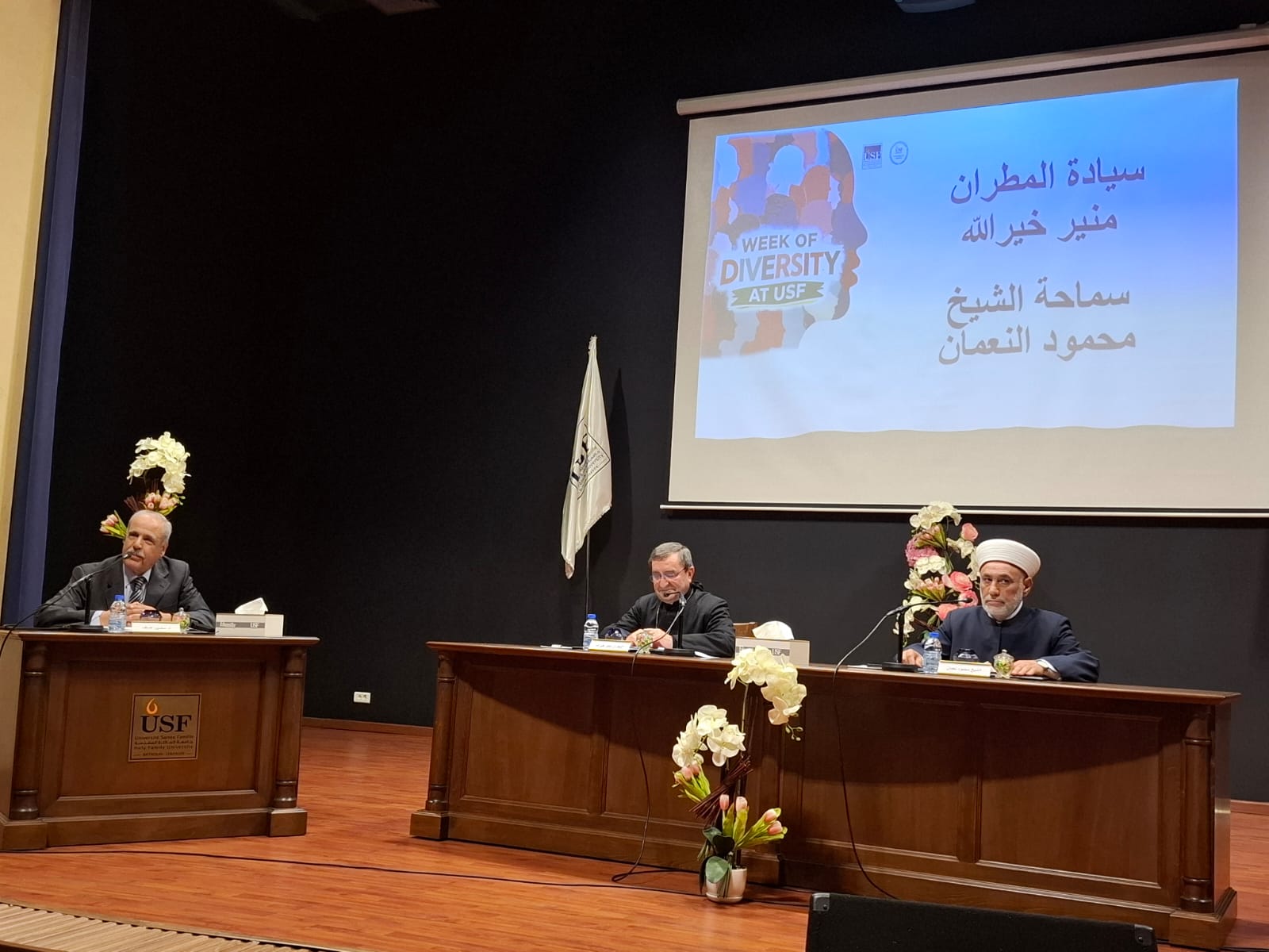 افتتحت جامعة العائلة المقدسة -البترون وبالتعاون مع خلية المسؤولية الاجتماعية فيها والهيئة الطلاّبيّة، فعاليات اسبوع التنوع بلقاء حواري حول “التنوع الديني في لبنان:العيش المشترك والحوار” شارك فيه راعي أبرشية البترون المارونية المطران منير خيرالله وإمام مسجد البترون الشيخ محمود النعمان في حضور رئيسة الجامعة الاخت الدكتورة هيلدا شلالا، أعضاءِ مجلس الجامعة، الهيئتين التعليميّة والإداريّة في الجامعة، فريق عمل خلية المسؤولية الاجتماعية صاحبة الفكرة برئاسة الدكتور جوزيان أبي خطار عميدة كلية إدارة الأعمال وعدد كبير من الطلاب.